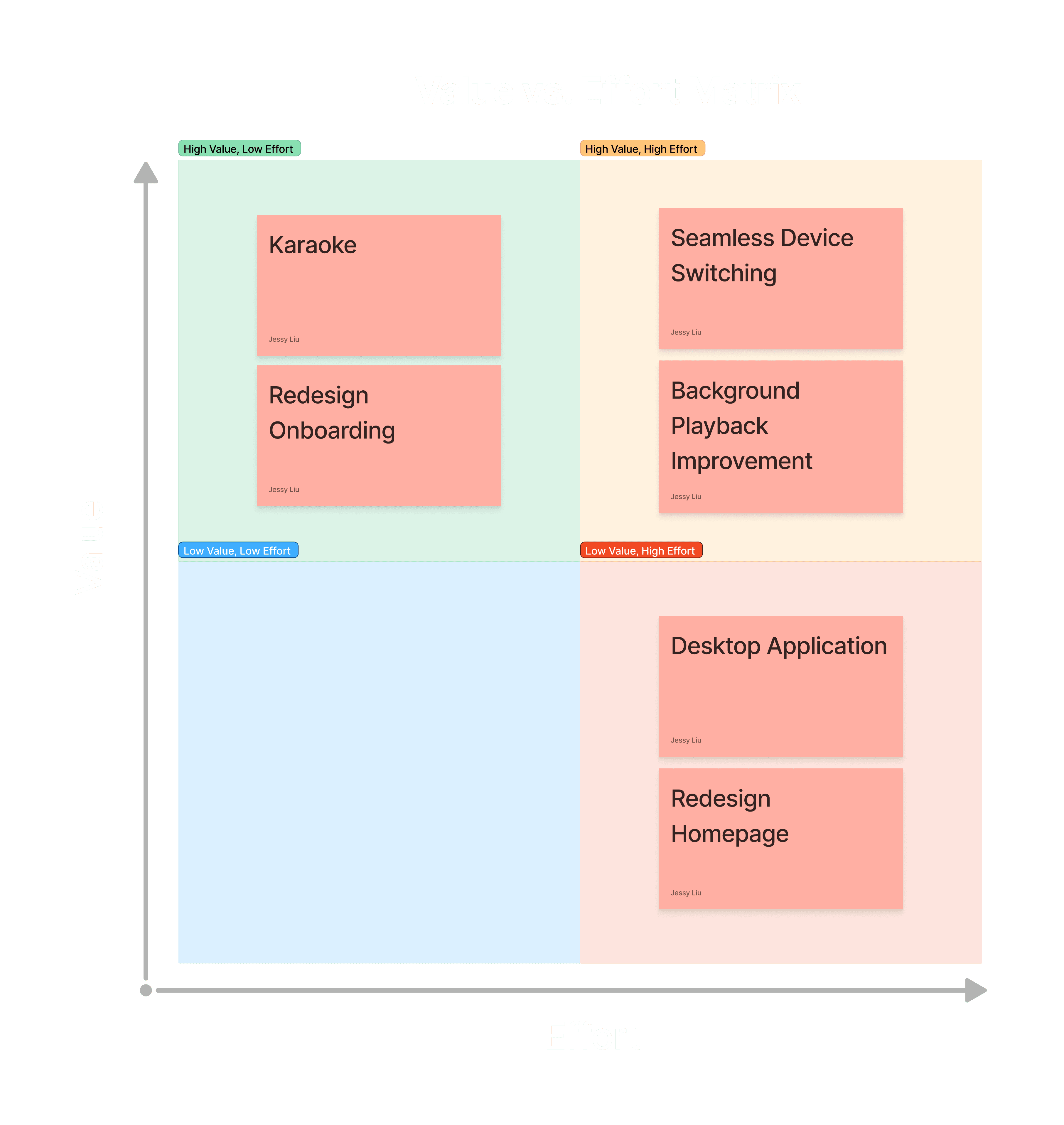 In the feature prioritization phase, I selected “Onboarding Redesign” and “Karaoke Feature” as the focus of this project. Beyond the results of the Value vs. Effort Matrix, the onboarding redesign strengthens accessibility for non-English speakers and visually impaired users. While not the most highly requested feature, it reflects the product’s human-centered values. Meanwhile, the karaoke feature is a popular request and is already offered by competing services. To prevent YouTube Music from falling behind and losing users interested in this feature, I considered it strategically important to elevate its priority.